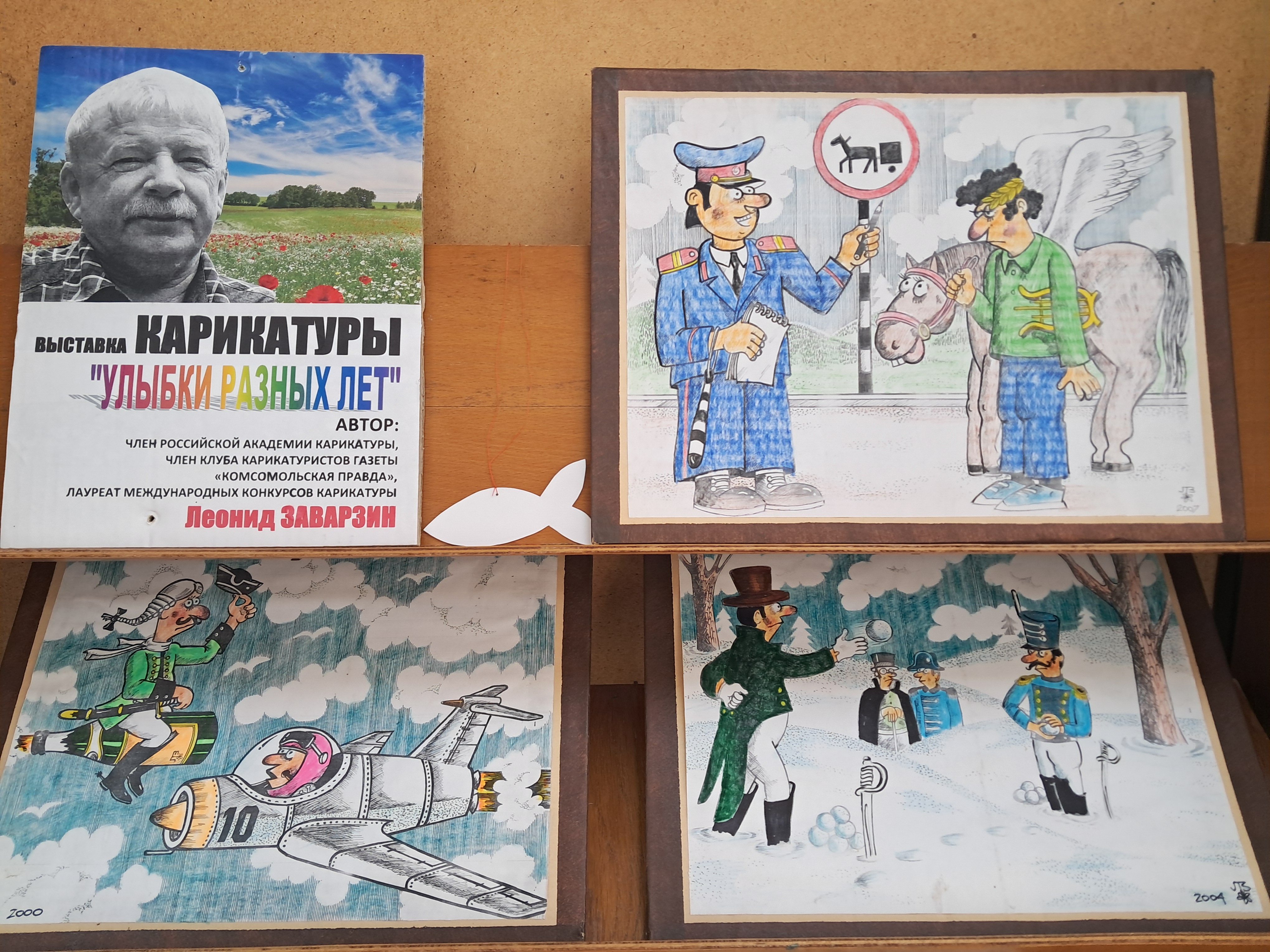 К дню юмора в читальном зале оформлена выставка карикатуры «Улыбки разных лет». Автор Леонид Заварзин является членом Российской академии карикатуры. Выставка продлится до 22 апреля.