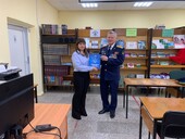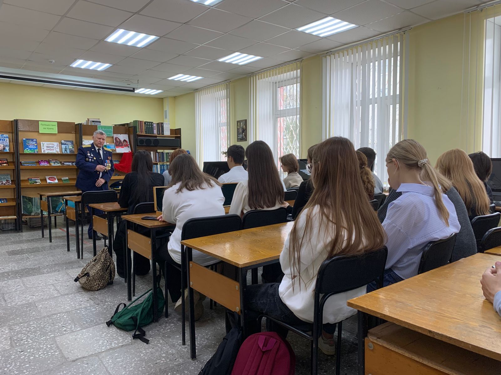 Ученики 10 "а" класса школы № 1 его внимательно слушали, а так же смотрели реквизиты, которые принёс Сергей Александрович, советский пистолет - пулемёт ППШ, автомат Калашникова и саблю.